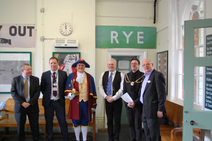 A small exhibition of train and station memorabilia has been officially launched at Rye station. It was opened on Monday February 20 with a speech from Rye mayor Cllr Jonathan Breeds, supported by the deputy town crier of Rye Paul Goring.
