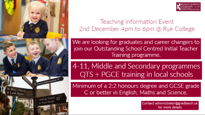 If you would like to know more about how to become a teacher bring your CV along to Rye College from 4pm next Monday.