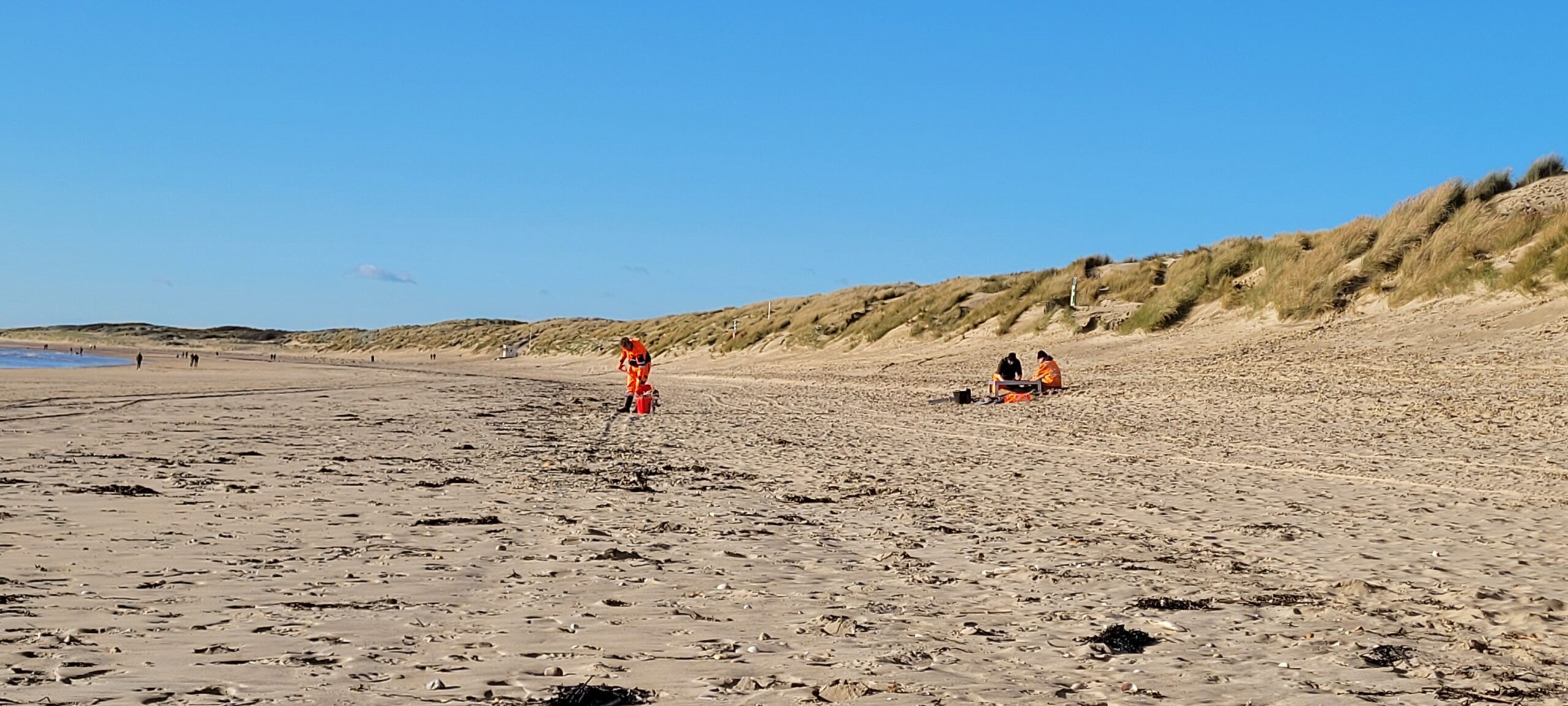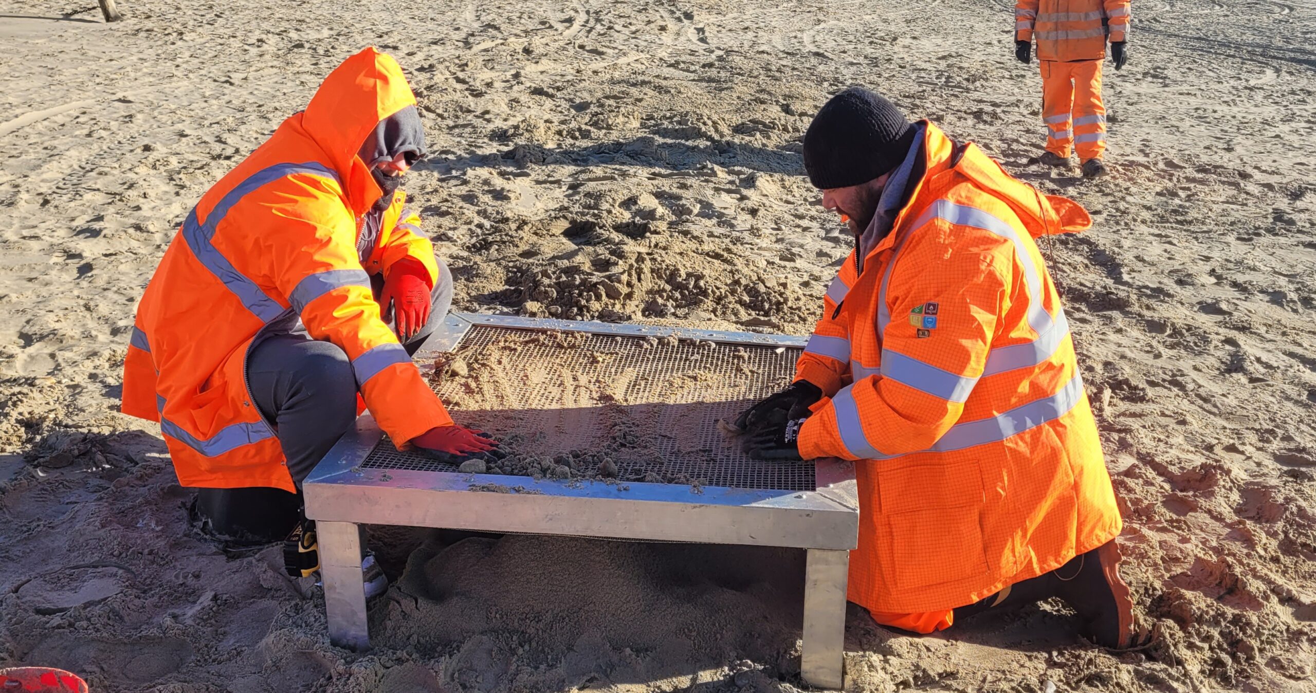 The Southern Water team work from 9am to 3pm, sifting the sand by hand along and above the strandline, using 4 square battery-operated sieves to filter out the bio-beads from buckets of sand. On Tuesday 25 November, the team worked in sections along the beach around the Kit Kat cafe and in areas where the beads were most concentrated.