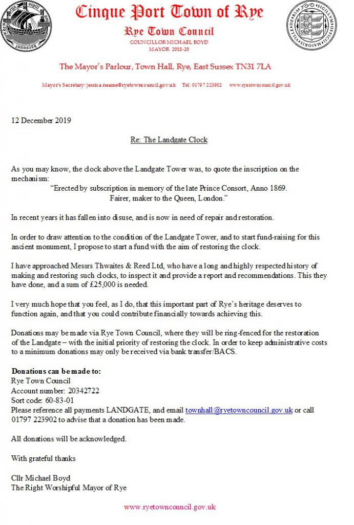 How one must agree with Allan Downend, Rother district council took full responsibility for the Landgate Tower many years ago, and it is not up to Rye town council, or the residents of Rye, to pick up the tab,as they were the ones that allowed the Landgate to fall into years of neglect, and this lasting damage,is the failure of councillors on Rother district Council, who’s only priority has been Bexhill.