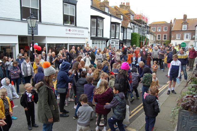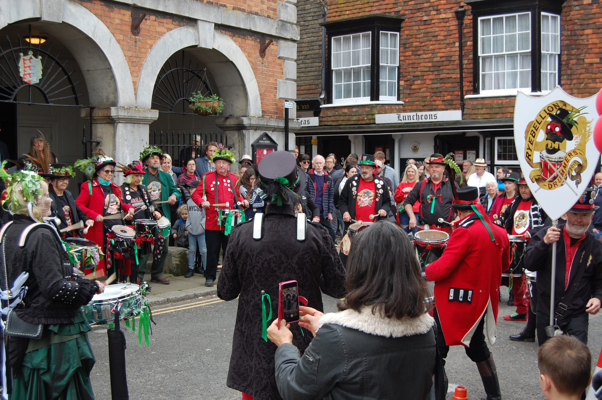 It was time now for the ceremony of throwing the pennies, no longer heated as in former times. An eager crowd of children had assembled with a goodly group of adults in the street below. The excitement was palpable as the pennies rained down and were caught or picked up by the scrabbling youngsters, some with plastic bags to catch the bright copper coins, The event was rounded off as the crowd dispersed by the lively percussion of Ryebellion drummers with their rhythmic sounds parading down to Cinque Ports Street.