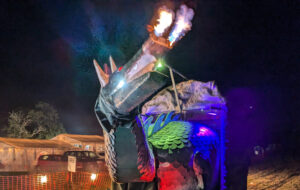 One of the highlights of the procession is the appearance of the impressive, fire-breathing green dragon, Scorcher, which is pulled around the town belching smoke and flames, delighting the crowd by leaning towards them as she passes. You can read about Scorcher’s history here.