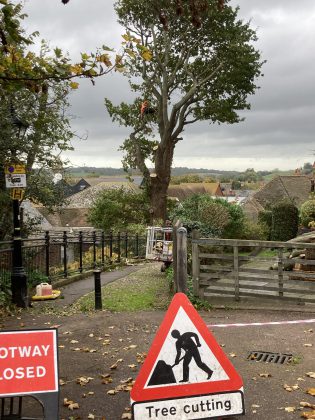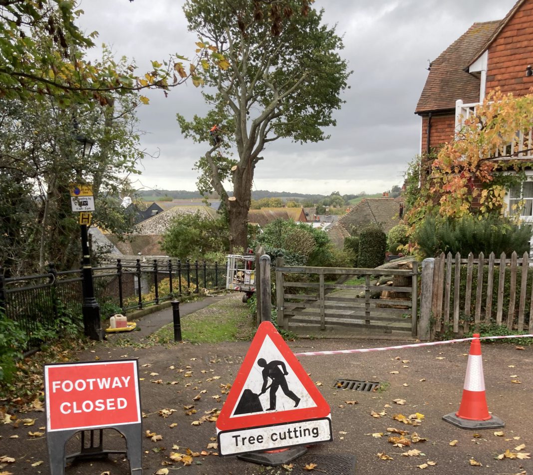 Two large well-established oak trees growing in the cliff face between houses in the Strand and Traders Passage were deemed to be “causing rock falls and contributing to instability of the cliff” by Rother District Council, and so were destined to be cut down starting the week of September 5.