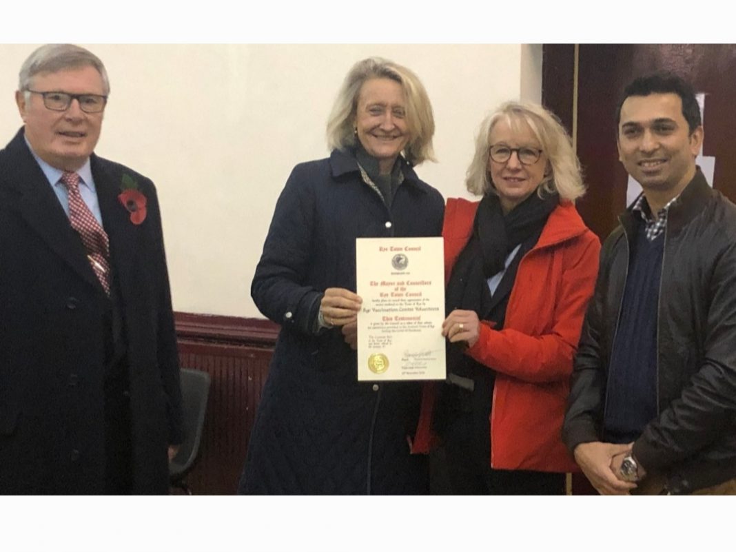 Rye mayor, Councillor Rebekah Gilbert presented the award at a special council meeting on Friday, November 12. With Anthony Kimber (REACT) and Ankit Tyagyi (lead from Clarity Chemists), both of whom had worked to bring vaccinations to Rye, looking on, volunteer coordinators, Tamsin Visick and Chrissy Rodger received the award on behalf of all the volunteers. Sadly Covid-19 rules meant that only a small delegation could attend.