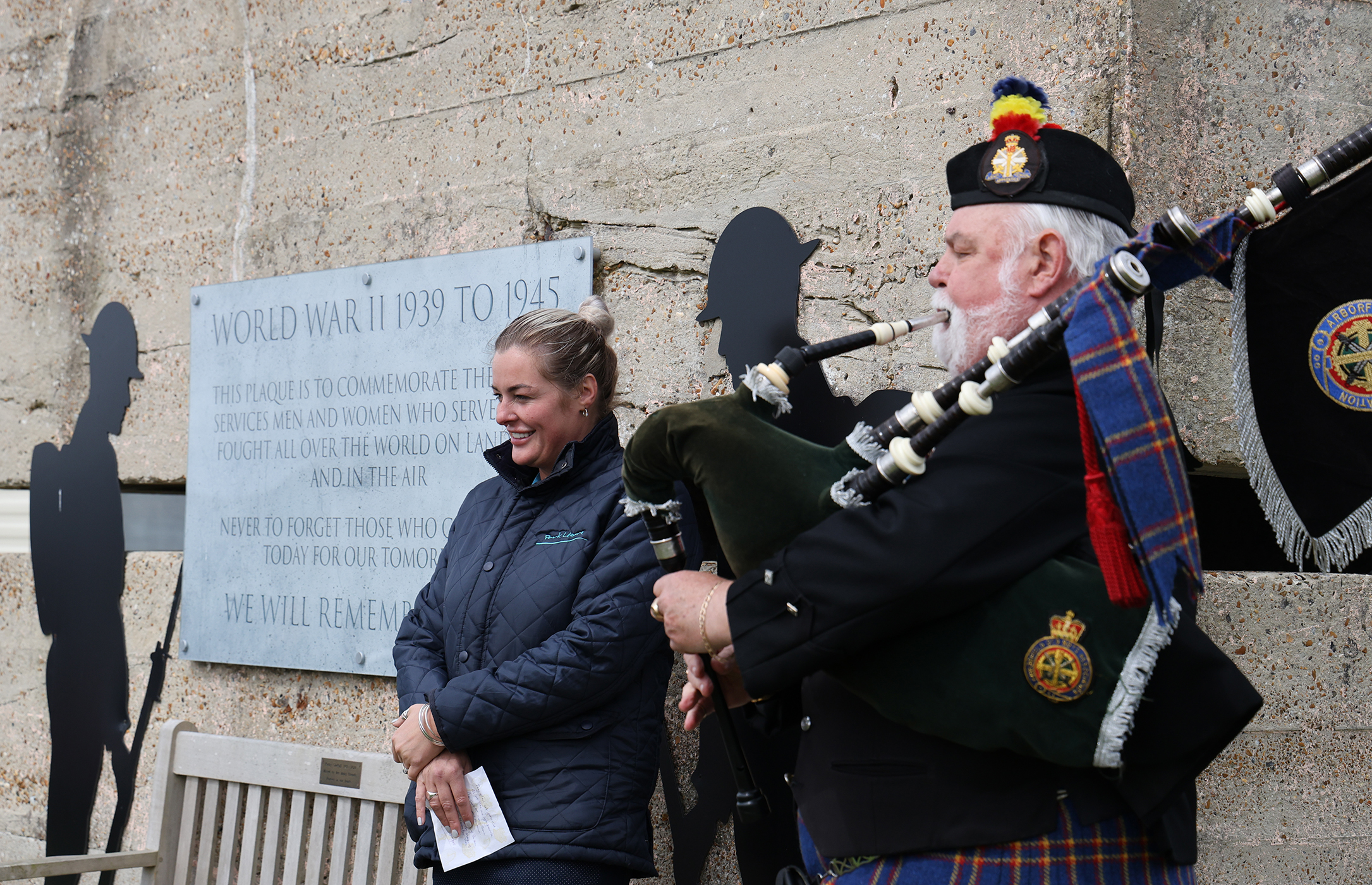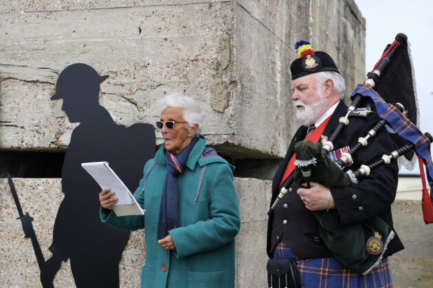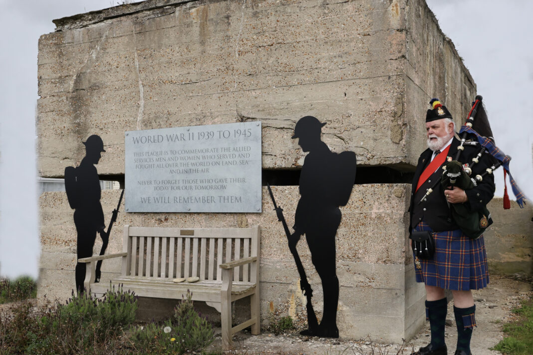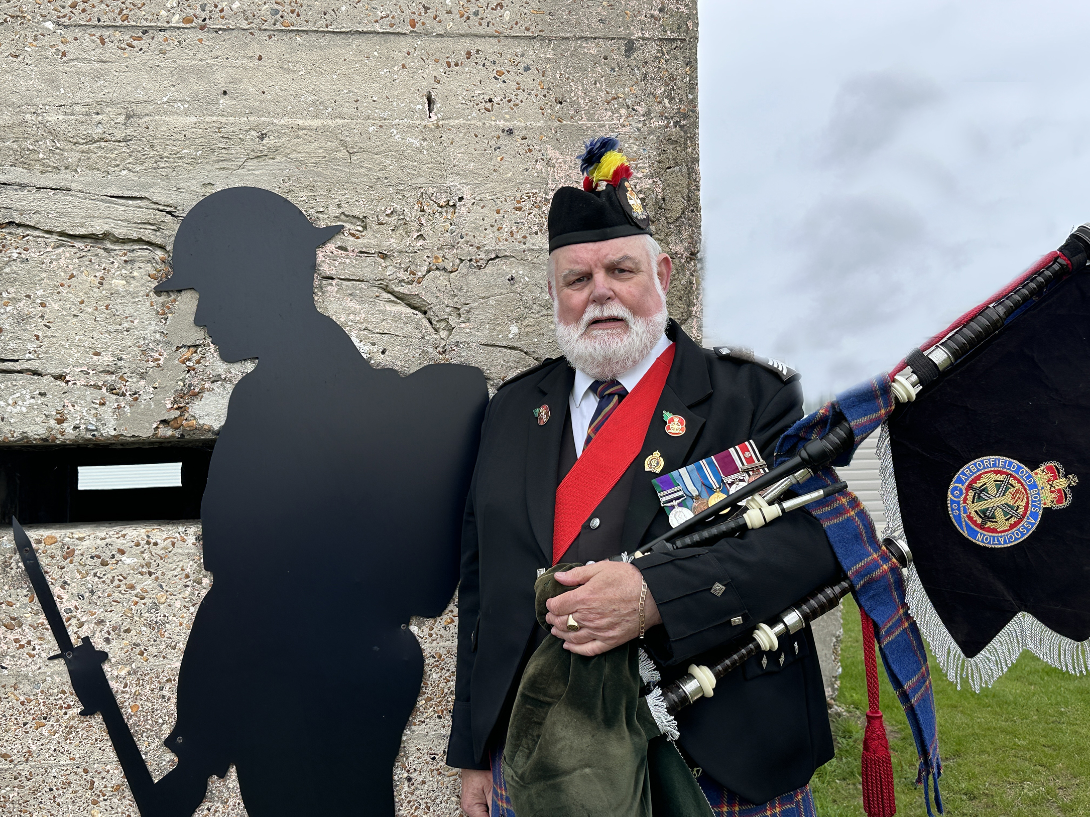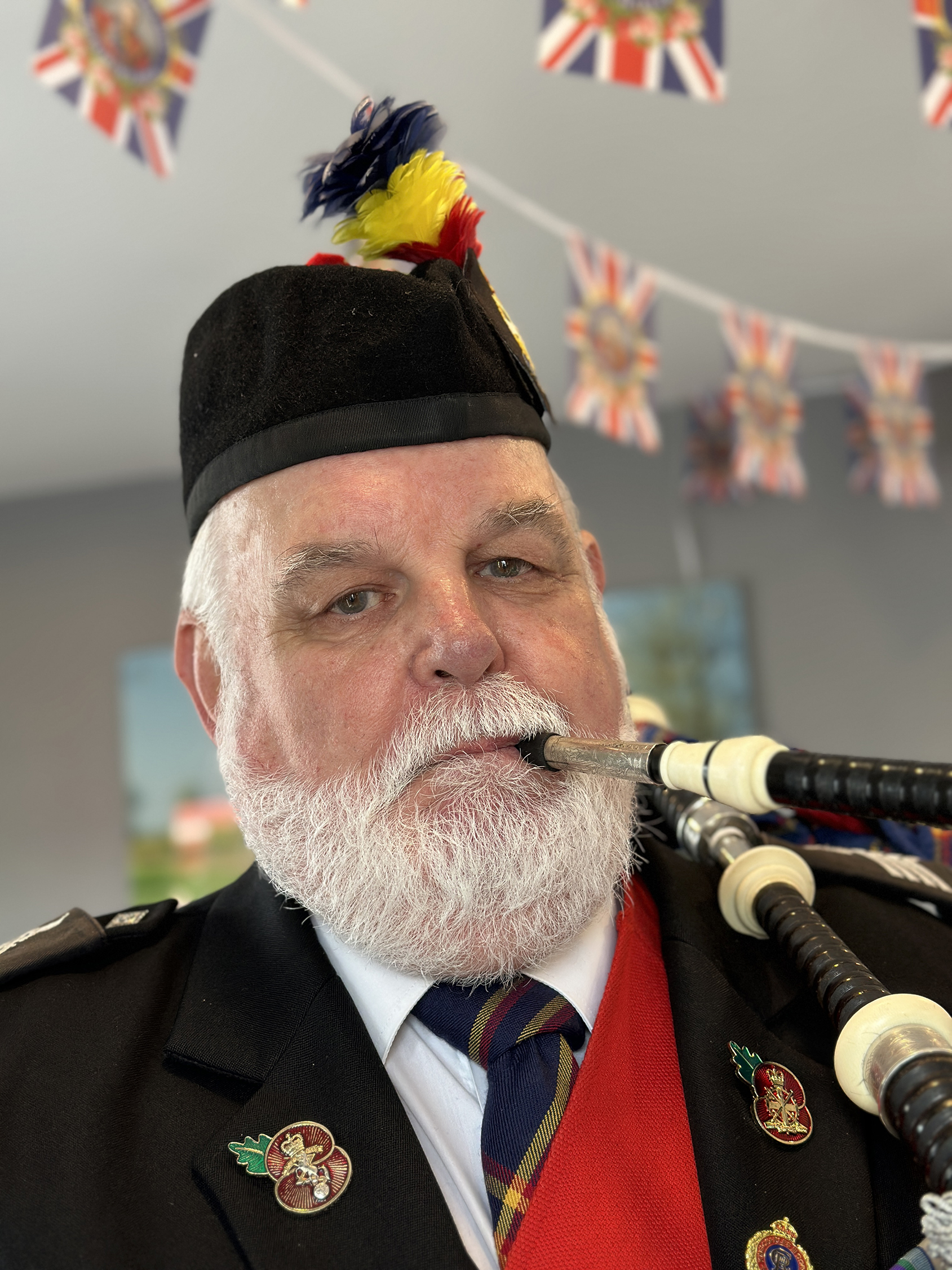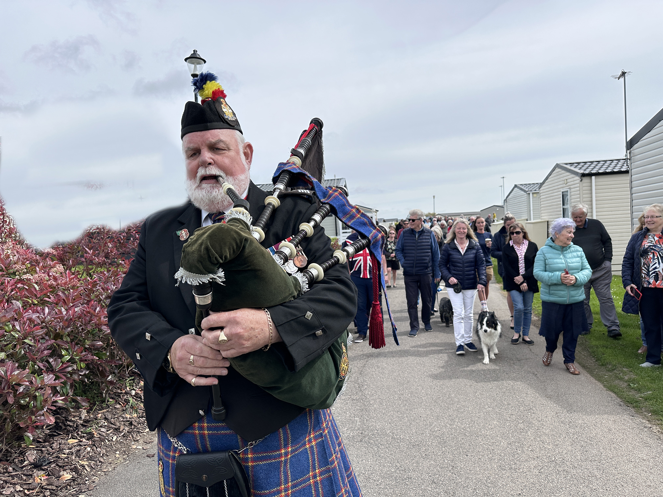Alex Burt, a caravan owner at Rye Harbour Holiday Park, had the idea of celebrating the anniversary of VE Day on May 8. Attired in his kilt and clutching his bagpipes he explained a little about how the idea had come about. He joined the army in January 1962 as a fifteen year-old boy soldier and served twenty-five years in the Royal Electrical and Mechanical Engineers and VE Day has always been a special day for him.
