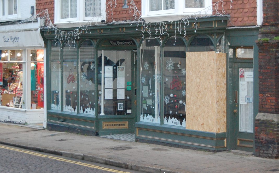 The shop was partially boarded up the following day, to protect the damaged sheet glass window. Subsequently however, the whole shop front to the right of the doorway was boarded up, suggesting that the damage was indeed more structural. Repair works are being put in hand by the tea room’s proprietors, Canterbury Oast Trust.