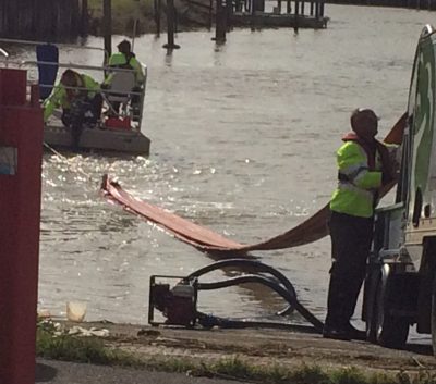 After what appeared to be a somewhat hesitant start, the boom, attached by a rope to the floating platform (one can hardly call it a boat) was pulled out into the river, section by section with each section being inflated as it came off the drum.