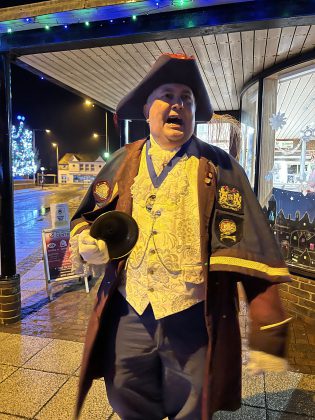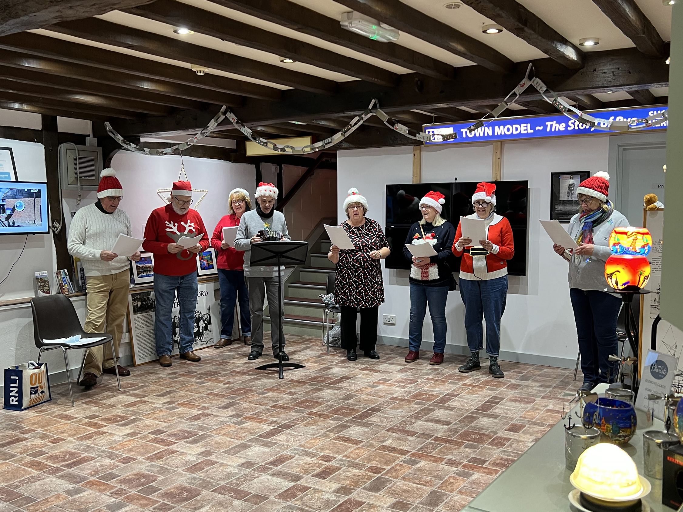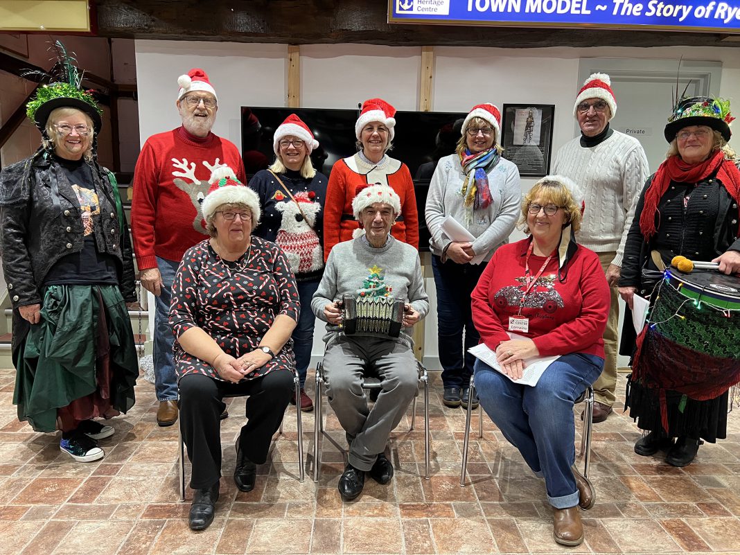 Round Rye Bay Singers, the shanty group brain-child of Martin Bruce, performed carols at the Heritage Centre to an appreciative audience of all ages. Paul Goring, the wonderful town crier of Rye, heralded the performance by his “Oyez! Oyez!” (the French word for listen) and welcomed people to gather round and enjoy the singing. Martin accompanied his group on the concertina. They ended the performance with their signature shanty Round Rye Bay for more and were rewarded by great applause and enjoyment.