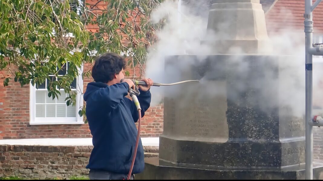 The work is being carried out by stonemason Elliot Brotherton of eB Sculpture who has worked previously on the memorial, the church and on the Camber Road memorial to early WW1 military flyers in the east of Rye. He used a specialist superheated steam system that draws out the staining while shielding the stone’s natural protective patina, and has been used to clean many memorials, including the Cenotaph.