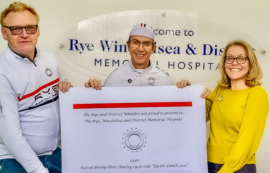 At a presentation ceremony last week Phil Lawson, chair of Rye Wheelers, and Up For Lunch administrator David Richardson, handed over a giant cheque to Fran Clent, chief fundraiser for the hospital.