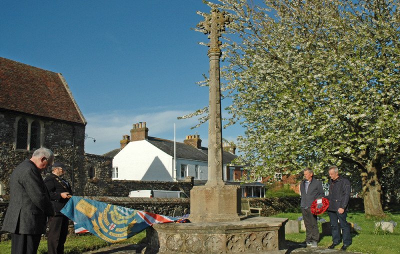 At Saturday’s ceremony, attended by members of the Griffin family, who still live in the area, a prayer was offered by the Rector of Winchelsea, Robin Whitehead. A two-minute silence was observed and a wreath carrying the arms of the Royal Sussex was laid by Robert’s grandnephews, Stephen and Paul (Paul also served in the regiment). A standard was lowered in honour of Robert by members of the Vipers, the regimental association of the Queens’ Division, into which the Royal Sussex was merged in 1966 (which has now become the Princess of Wales’ Regiment). In addition, a ceramic poppy carrying Robert’s name was placed in St Thomas’ Church, alongside two others commemorating those of Winchelsea’s Great War dead who have already been commemorated. These can be seen above the three tombs on the north side of the church. The wreath and poppy were provided by the Winchelsea Bonfire Boyes.