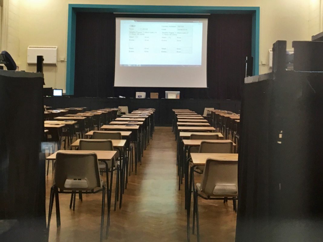 The exam room, in the Milligan Theatre Hall, is laid out in rows and numbers, with each student designated their place. In the hall, students file in and sit in their assigned seats with exam papers on the table, as the rules are explained and the timer begins.