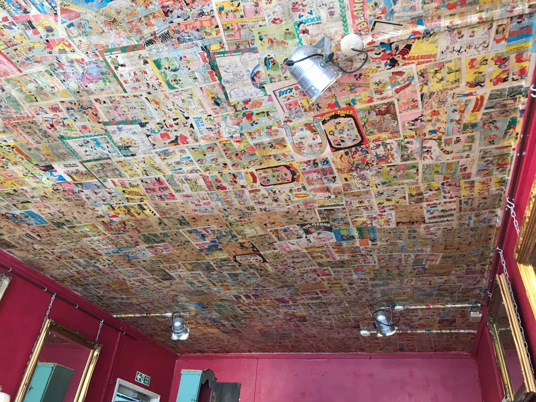 Through the main reception and dining area, steps take you through to the rear dining rooms, the larger of the two holds quite a surprise. Looking up to the ceiling you are not wowed by the intricate dentiled cornicing or ceiling rose that you may have expected, and Michelangelo certainly wasn’t engaged to decorate the ceiling, instead the whole ceiling is completely covered in pages from the Dandy and Beano comics. A veritable collage of comics and although quite unexpected, they fit in well with the building, furnishings and “bespoke” interior.