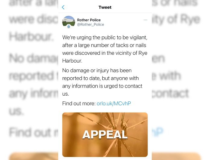 Rother Police have been tweeting (see photo above) but, while lots of residents contacted Rye News about tacks scattered around Strand Quay, nobody has contacted us about another tacky outbreak at Rye Harbour. Perhaps Rother police are confused?