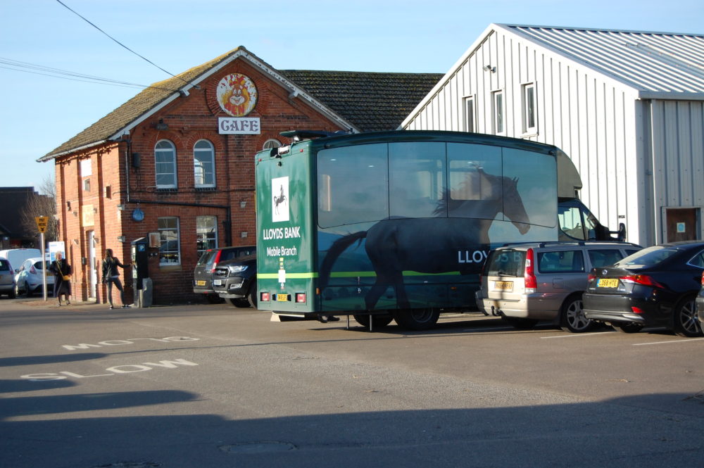 Lloyds’ mobile van appears never greatly busy. The presence of an attendant to ensure customers’ safety as they climb up the ladder steps makes one wonder at this use of manpower. However, Lloyds say that this service will continue “for as long as it is needed.”