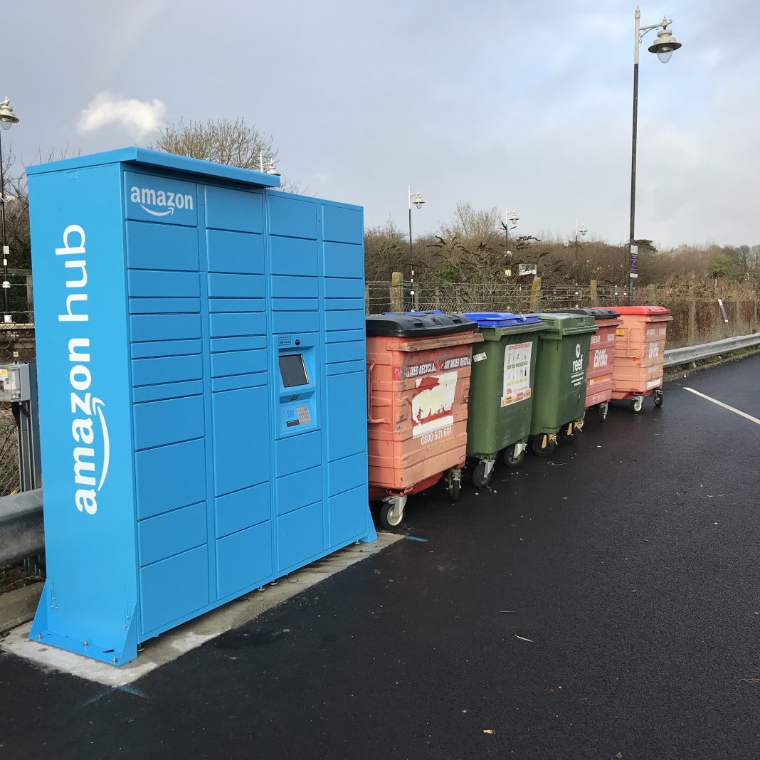 The machine is akin to a left luggage box, which used to be found at major provincial railway stations and the London termini before the period of IRA bombing closed them all down. Presumably, the pre-notified dispatch number of the Amazon requested article is logged into the key pad and with a “Hey Presto” or “Open Sesame” the locker door swings open to reveal another fleetingly cherished item of must-have possession. The site of the hub next to the recycling point as seen in the picture might give the game away to the cynically minded.