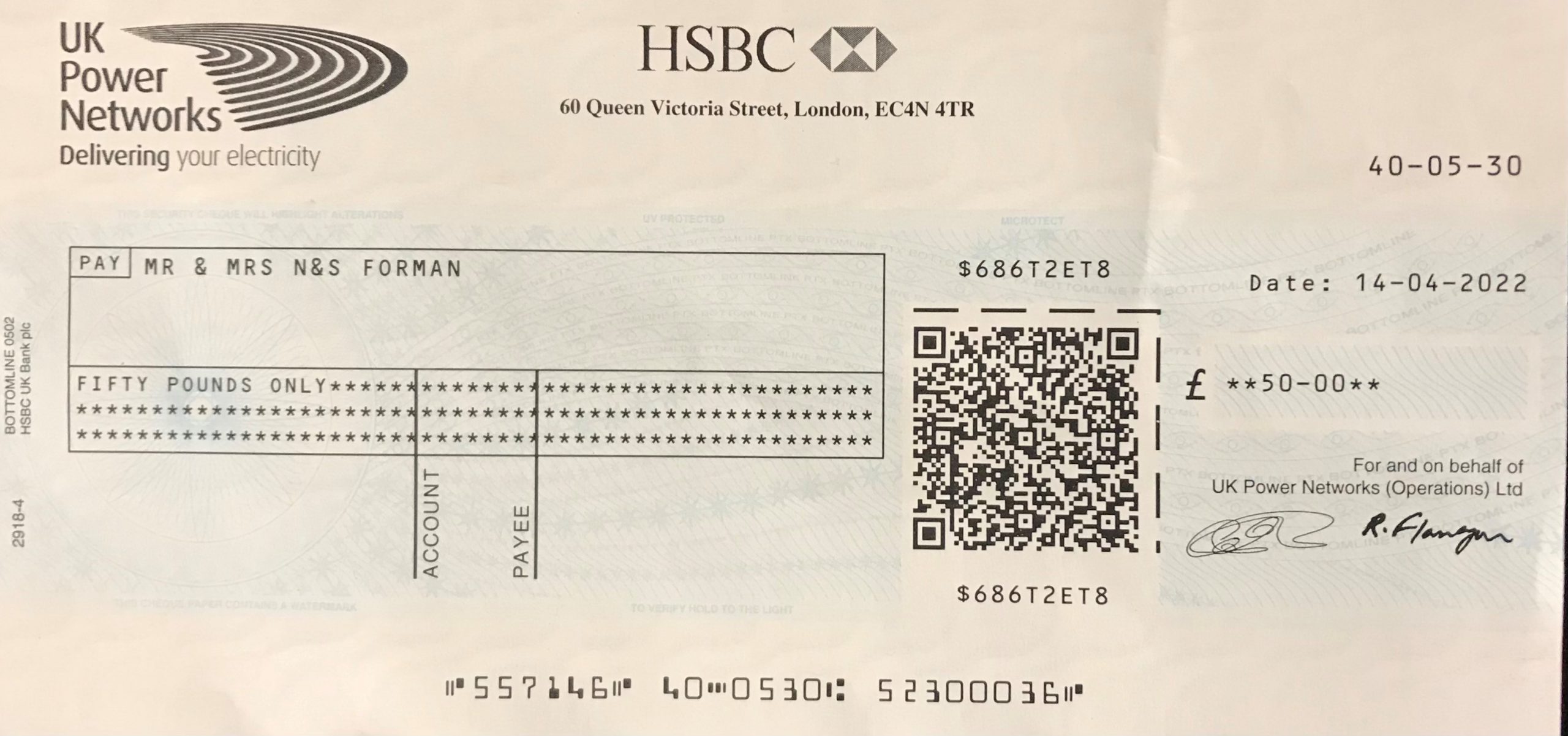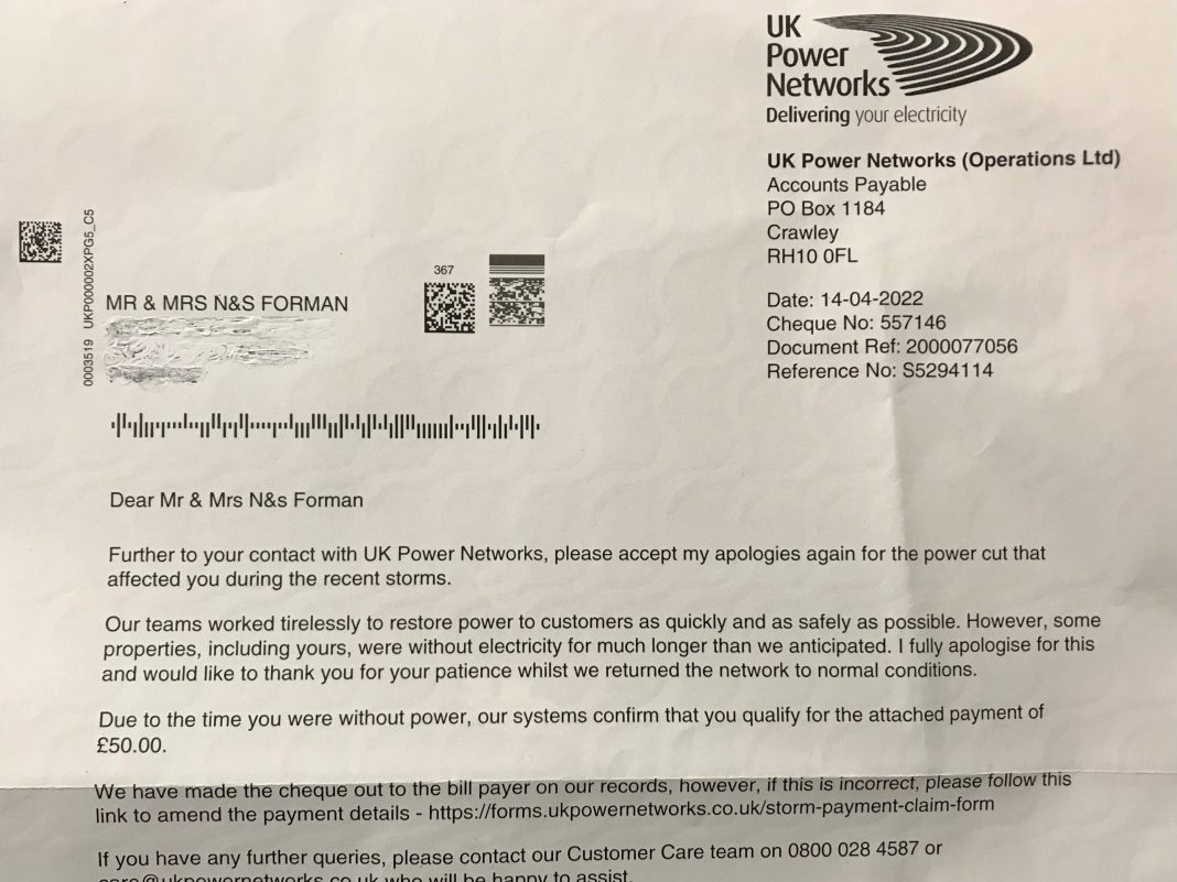 I thought no further of it, life at home had returned to something resembling normality then to my complete surprise and amazement I received the attached letter from UK Power Networks apologising for the inconvenience caused during the recent storms, due to the power cuts and attached to the letter was this cheque for £50 which was quite unexpected.