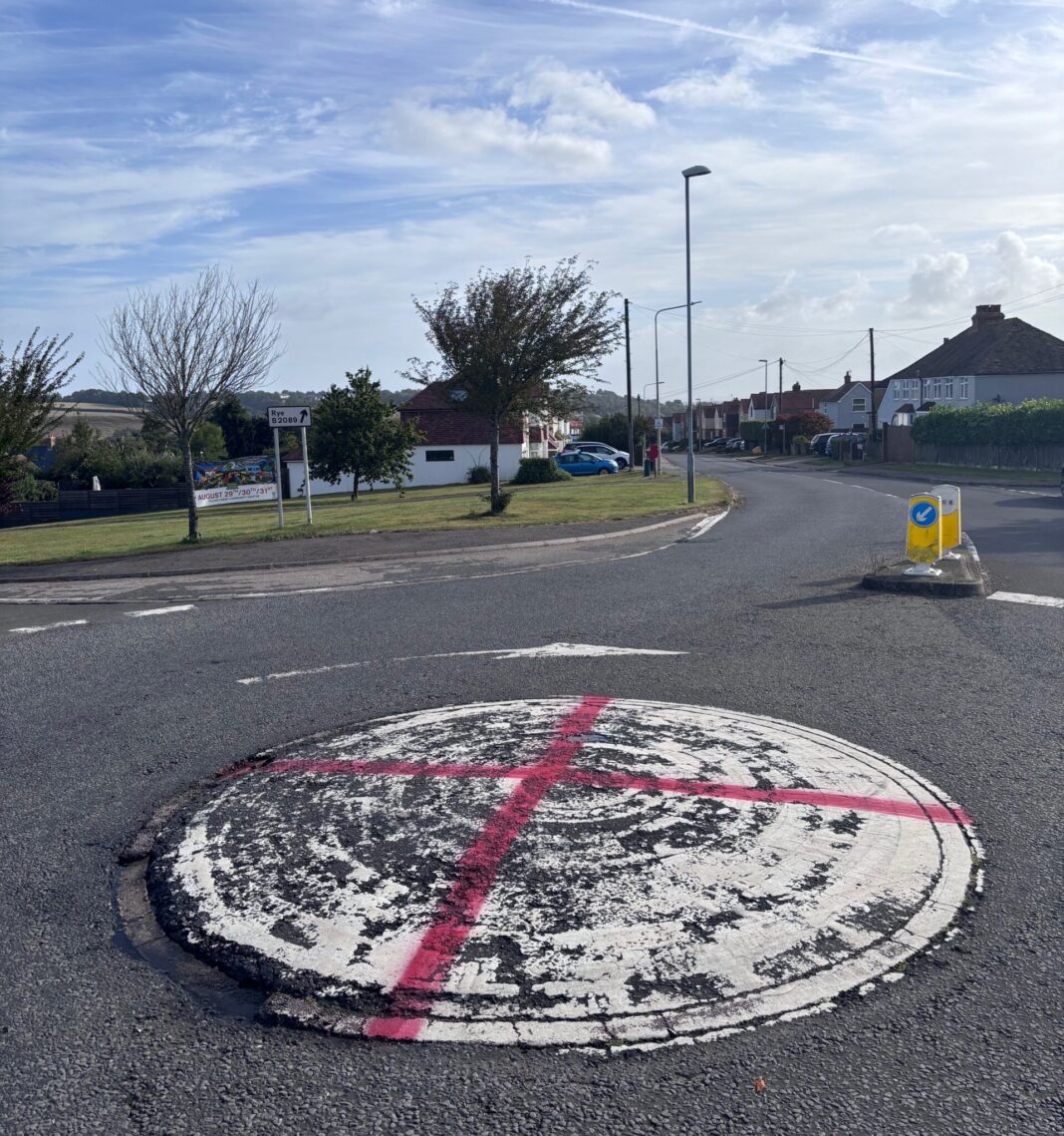 10. The red ‘St George cross’ has again been (partially) re-daubed at this roundabout, after Rother painted it white this week.