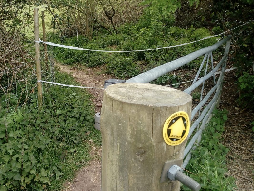 [Editor’s note: At this time of the year, with lambing still under way, this could be a farming response to dog walkers not keeping their dogs under control and causing injury or death among the sheep and baby lambs. But it is also very clearly, as your photo shows, a public footpath.