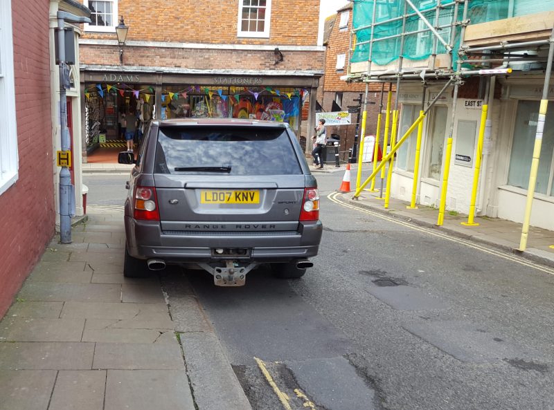 The Range Rover (right) was snapped in East Street, a one way street. The vehicle was facing the wrong way, parked on a double yellow line and obstructing the pavement, but doubtless got away with it.