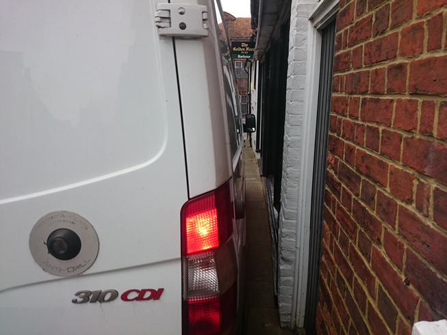 Sadly we continue to have major problems with the Turners Fine Foods delivery van in Lion Street six days a week, despite the assurances the company director previously gave you about resolving the matter. The driver will not park anywhere else except opposite my house. As you can see from the photograph all traffic for up to half an hour today, and yesterday for more than an hour, was being forced to pass dangerously close the front door here and the door of The Golden Fleece shop. On several other occasions the driver has also moved our dustbins outside the house by placing them in our front porch in order to allow vehicles to squeeze through this very narrow gap. By so doing she is doubly obstructing access for my eighty two year old mother to and from the house. I would be most grateful if you contact the company directors again and remind them of their previous undertakings. After all we know that one of them came here once and witnessed the problems for himself.
