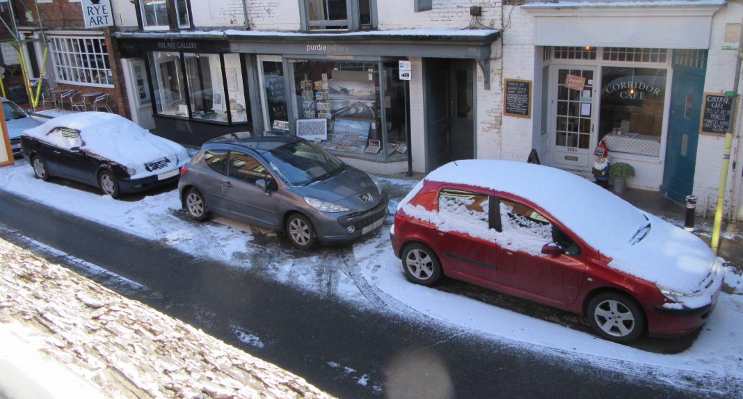 Rye News often features stories of bad parking in Rye and will typically show a delivery van on double yellow lines or straddling the pavement, making life difficult for road users and pedestrians. The recent snow has been useful in revealing who the real culprits are: locals who use the High Street as a long stay parking facility, when supposedly there is a one hour maximum stay. This photo was taken on Wednesday afternoon, when the last heavy snow had fallen during Tuesday morning. In my estimation, almost half the cars along the High Street had not moved in more than 24 hours.