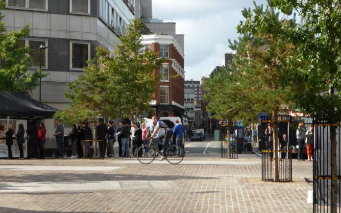 The object of shared space is to improve safety by encouraging negotiation of priority between different road users. If you don’t exactly know who has right of way, you tend to seek eye contact with other road users. Speed is reduced, you take more care and you interact reasonably with your fellow humans. The result should be a slower, smoother flow with reduced anxiety and increased well-being all round.