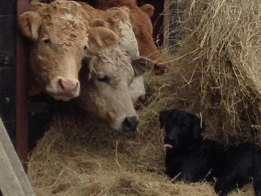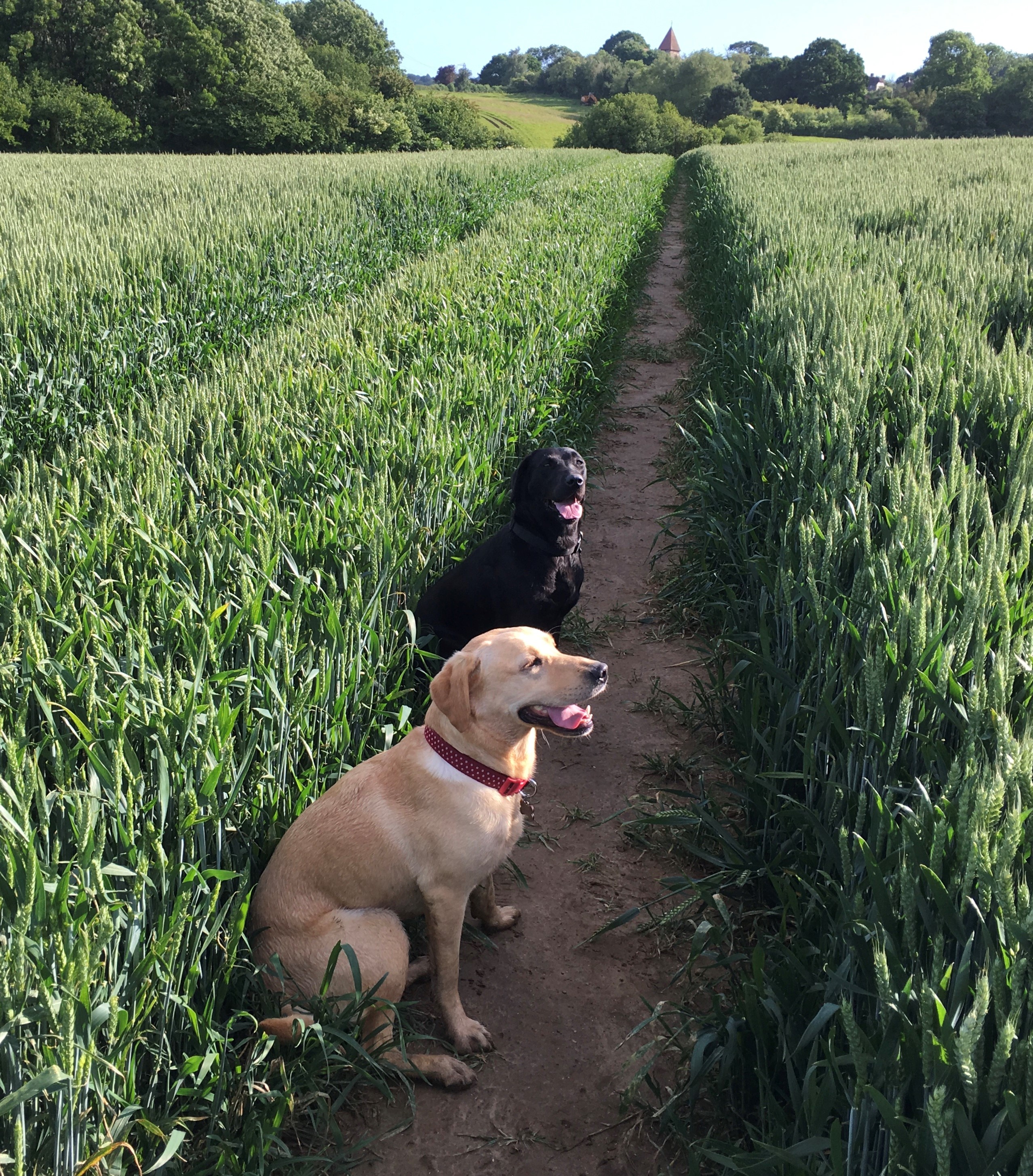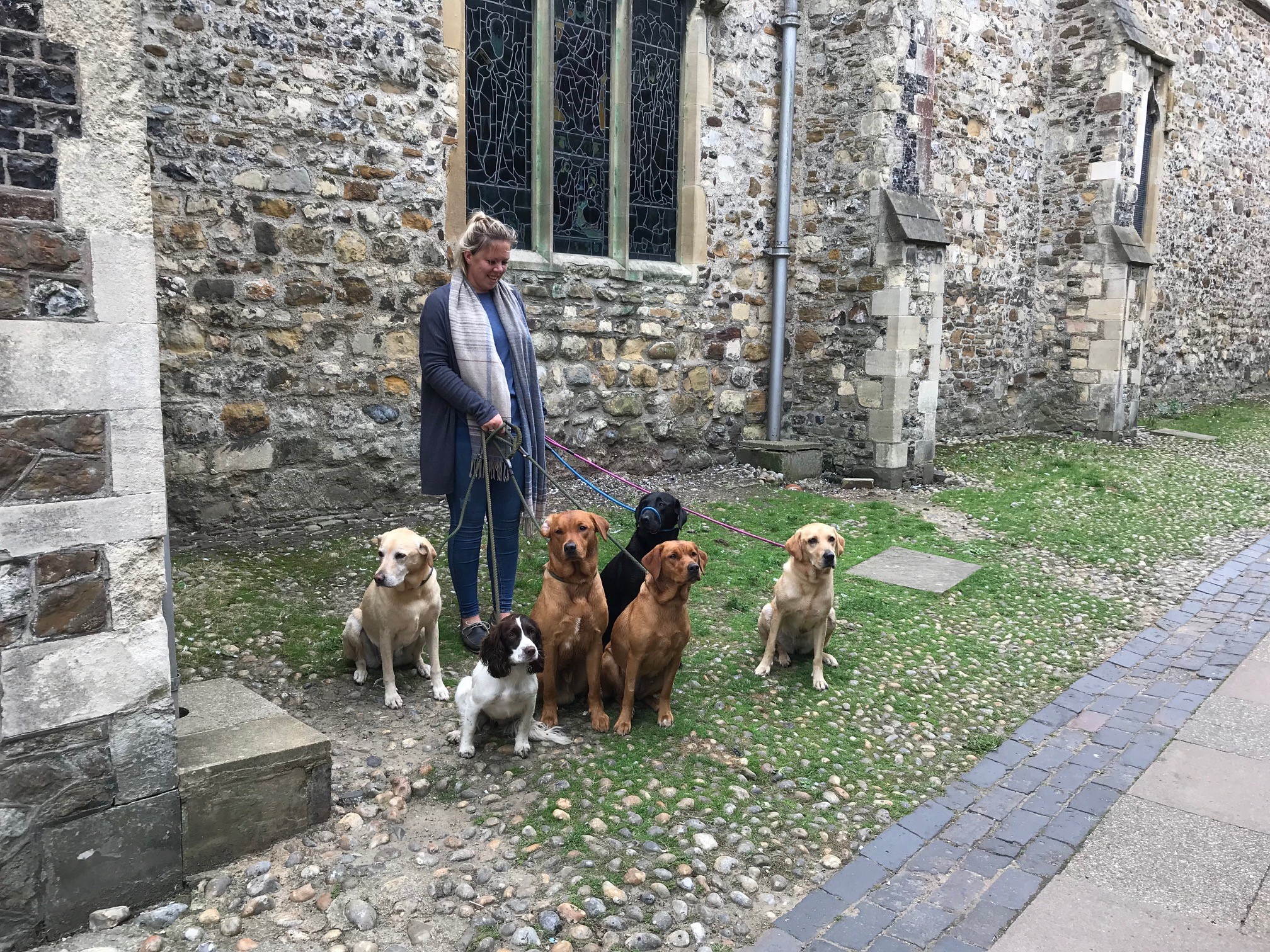 Hopefully these photos will bring a smile, and the main shot is of my son’s working labrador, Echo, poking his tongue out at the cows on the farm, and the nonchalant look on the cows’ faces suggests they aren’t in the least bit bothered. The second shot includes Echo’s half sister Hollie, sat outside St Mary’s church last summer, with four other four legged friends as they wait patiently to continue their walk.