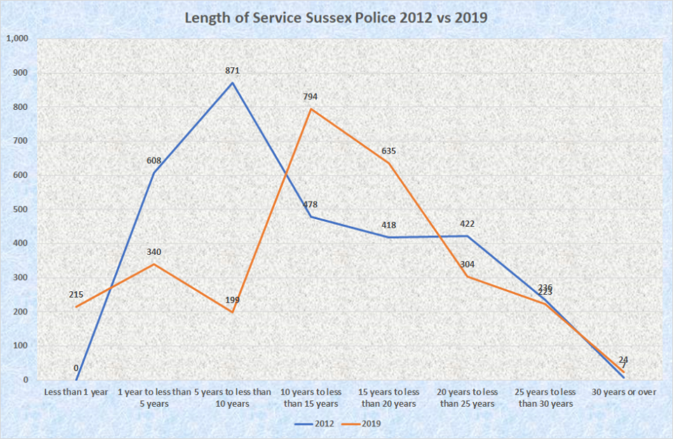 There is also a real issue with the loss of experience. A friend and former Metropolitan Police colleague of mine, Alan Wright, has compiled a graph depicting what this will look like for Sussex Police. It is reproduced here.