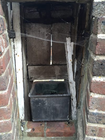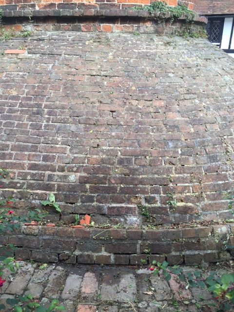 The pump is in a perilous state. I include photographs of the structure after weeding as high as we could reach that show not only how considerably weakened the mortar has become and how loose many of the bricks, but that the pump’s roof is now dropping tiles. There is also a leak at the base of the pump, (below right) rising a third of the way up the brickwork.