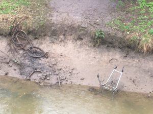The bicycle (there were two at one point) has been in and out of the water at least half a dozen times, but always gets pitched back in. It has now been joined by a shopping trolley, collecting river vegetation as it moves down the river towards the sluice. It isn’t a major problem to the river flow, but it reduces this lovely watercourse to a rubbish dump and there is more detritus by the sluice gates.