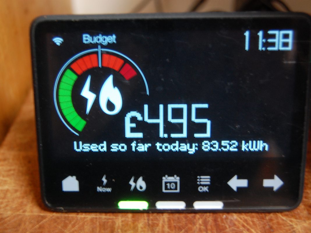 Two very competent young men duly arrived and proceeded to change the meter. Result? We now have one more useless gadget on our kitchen worktop. There it sat blinking away happily to itself, in green, orange and red, informing us that we had exceeded budget (hardly surprising, since we hadn’t set one!). We were alarmed for a day by its constant output of digital information, but it was not at all relevant to our requirements, nor will it save us money; after all we are a wartime generation which learnt well how to be thrifty. After three days we switched the thing off.
