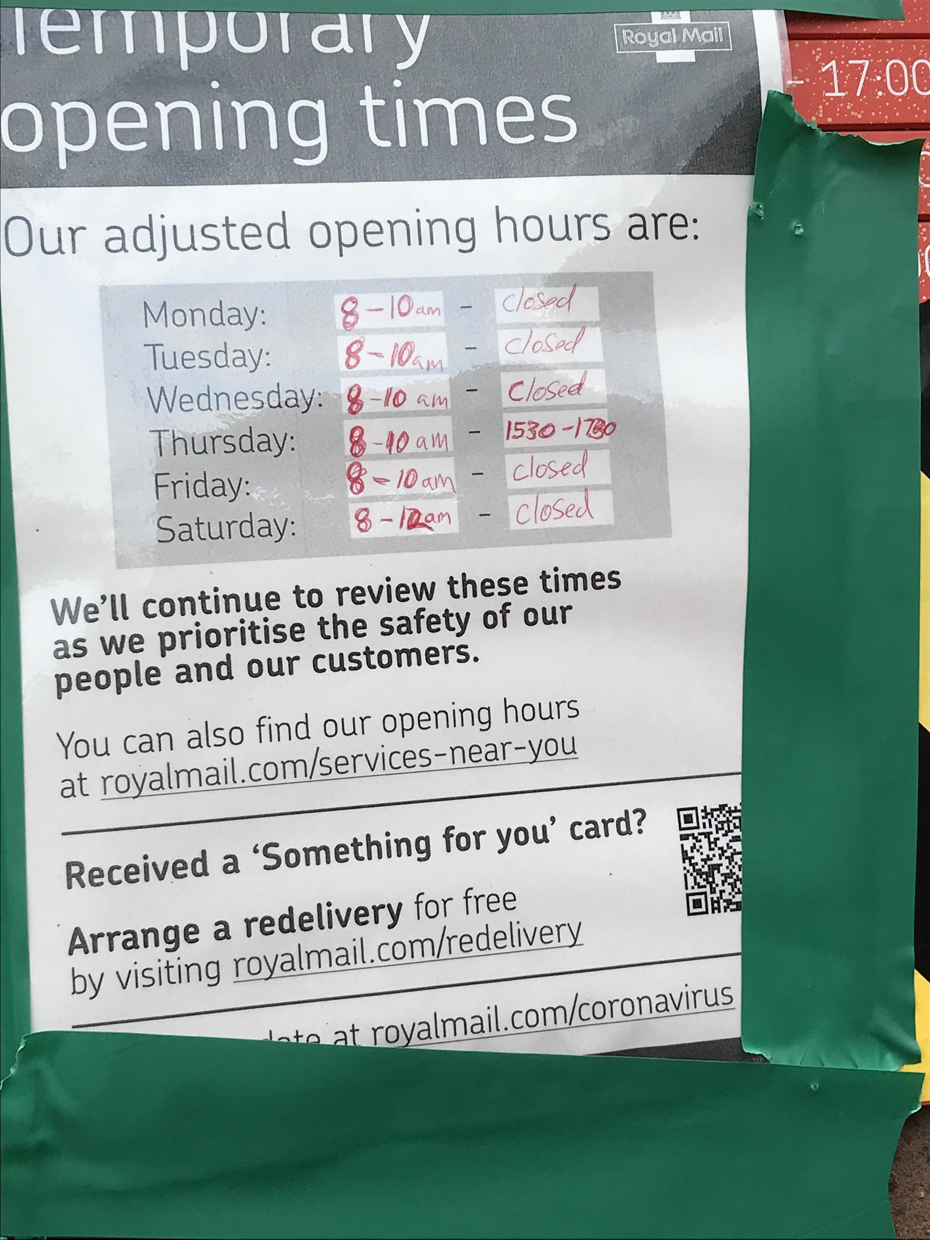 Some months ago I had occasion to collect a parcel from the sorting office. Although there is a notice supposedly displaying opening times, in fact it doesn’t, but after spending some time online and a long time waiting on the end of a phone, I was told what these times were and in due course I was able to collect my parcel. I was also told by the person on the phone and the person in the sorting office that a new notice with opening times would be displayed. Consequently, I didn’t keep my note of the actual opening times.