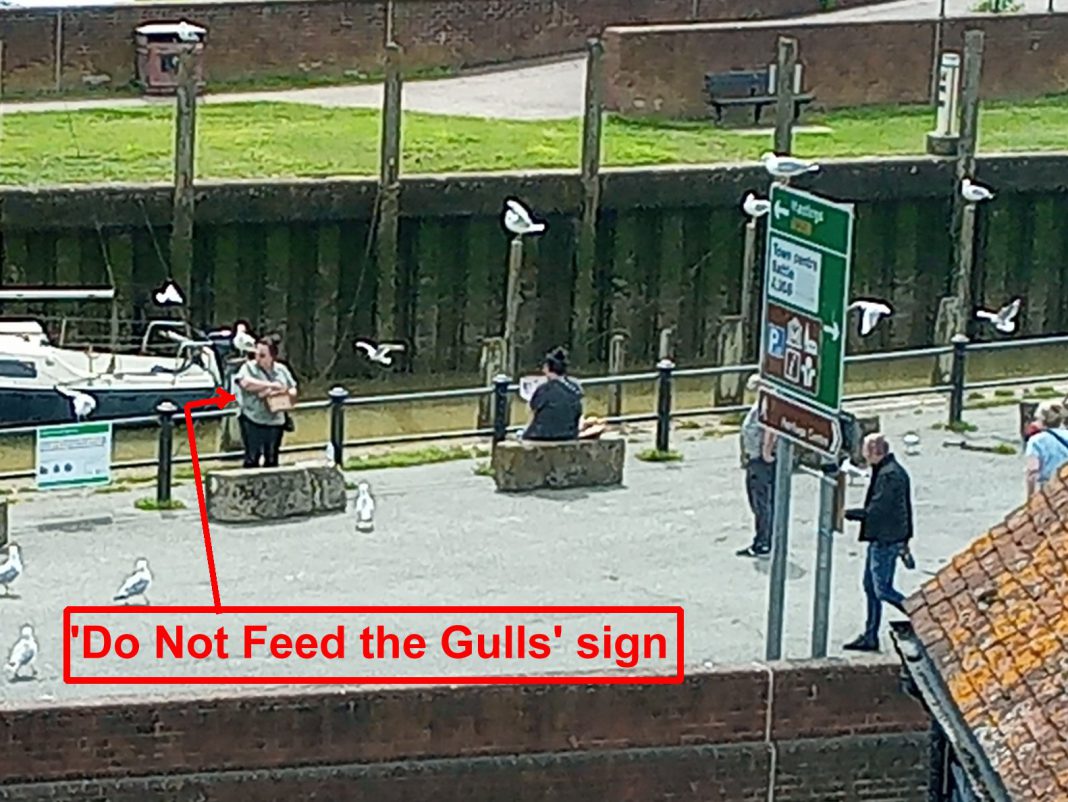 My photo shows someone feeding the gulls standing in front of one of the remaining signs. She had previously been sitting facing the sign which she should have noticed or simply chose to ignore. Come on harbour master, get some decent signs erected.