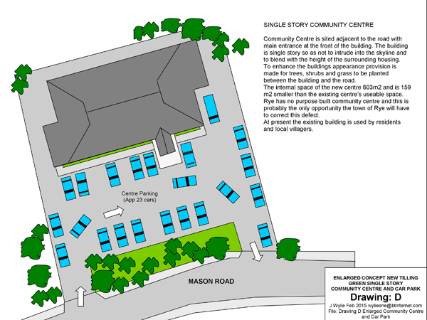 My concept building is designed with a low profile and is set back from the road so that it blends into the landscape. This is totally different from the developers’ community centre proposal; which showed a building of two storeys high sited adjacent to the road, with an entrance around the back and with very limited off road parking.