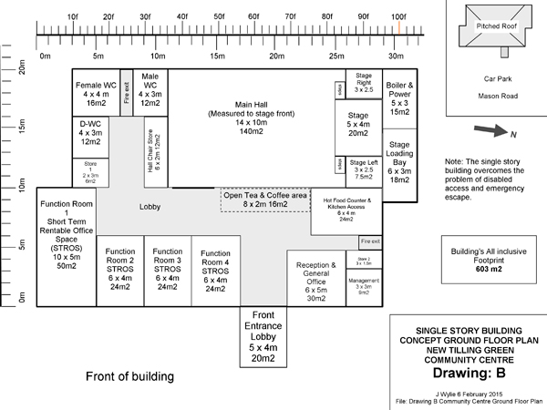 Unfortunately, due to copyright, I cannot supply a copy of the developers proposed drawings for comparison. The drawing is titled: Tilling Green Community Centre Sketch Plans Option 4B and shows the proposed centre. I do not have the overall site plans drawing reference number. These drawings  might be available on the web.