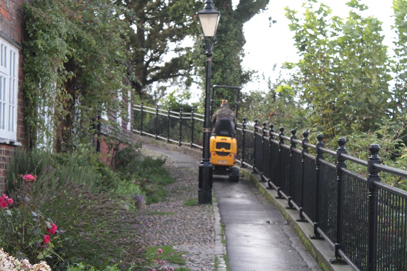 Tuesday: September 15 : 9:30 am-ish. I was making a cup of tea in our kitchen. Heard a loud noise. Assumed it was from Strand Quay. Carried on with what I was doing. Suddenly I saw a mini JCB going past my window. That was the noise explained. But what was it doing there – and why? I got my camera out and snapped the JCB continuing up Traders Passage. I then followed it. Past the Hope Anchor Hotel and along Watchbell Street. It turned into number 26 where renovation work has been going on for some time.