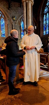 He had brought two more items with him. A cross made by his tiny granddaughter Fiadh, which he placed at the foot of the altar and another that had been given to him years before, in Oxfordshire by six-year-old Henry. It had been made from various bits of wood found on his family farm; this Jonathan placed on the altar. Henry was one of 12 members of one family, christened by him over the years. “Enough of my whimsy,” he announced and the service began.