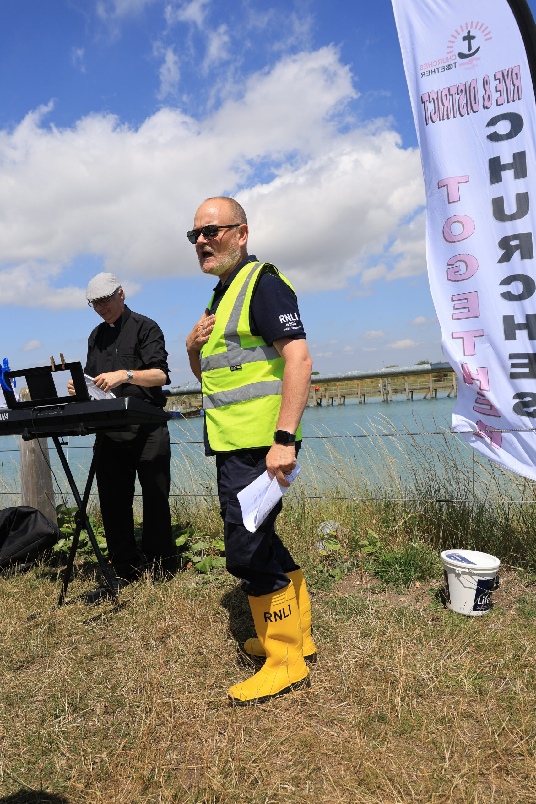 Paul White commented after the service: “It was lovely to lead the Sea Sunday service at Rye Harbour last Sunday. This is one of the regular events of Rye and District Churches Together and it was delightful that people from across all the churches in Rye took part in and attended the service. I was also really pleased to be joined by members of the Rye Harbour RNLI crew, not least as I was dressed in some of my lifeboat kit as I spoke about how the work they do is a great practical example of helping others regardless of who they are, just as we are shown in the parable of the Good Samaritan. It was a joy to worship in the sunshine, in this beautiful setting, and to bring to mind the importance of the sea on the history, life and culture of this place.”