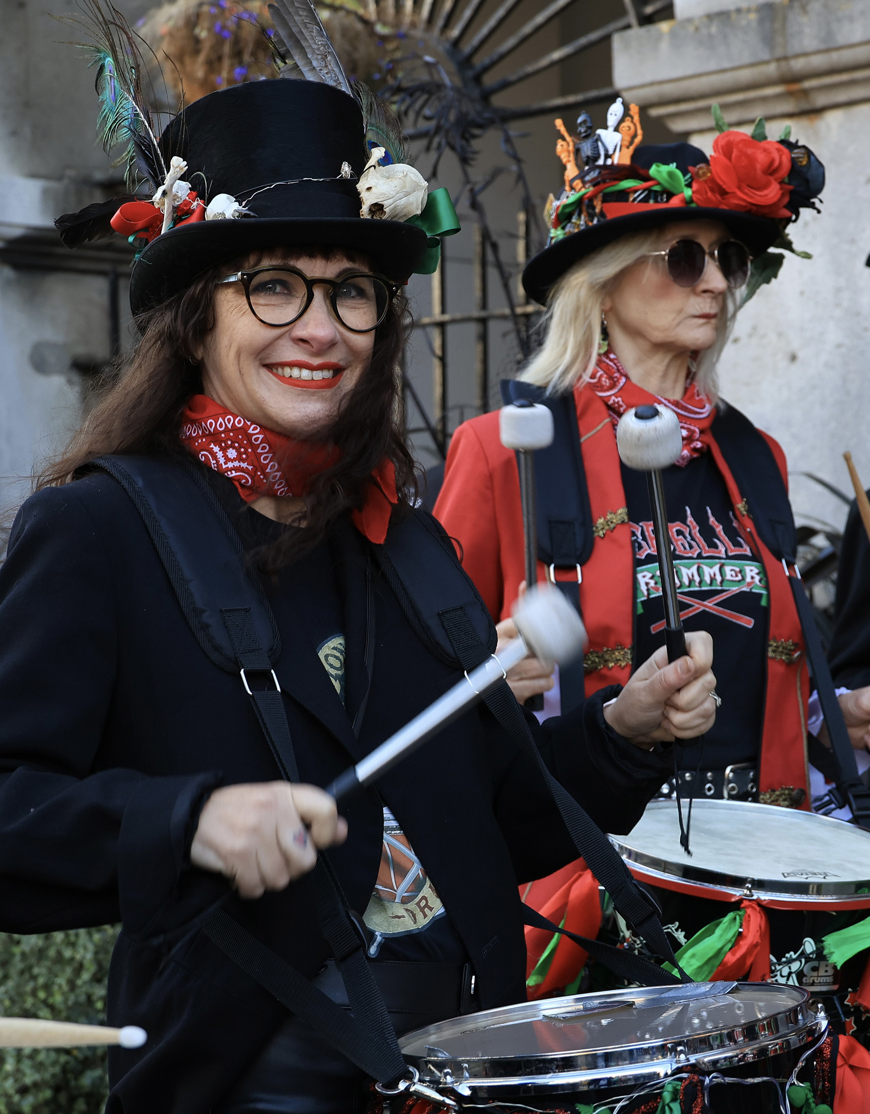 The criers assembled at the town hall and once they had registered they paused on the front steps and had the first of many group photos and were then ceremoniously drummed through the streets of Rye by Ryebellion Drummers. The criers stopped from time to time to have a ‘bells up’, much to the delight of the gathering crowds. The final stages of the walk were through the churchyard of St Mary’s and into the Gun Gardens where the competition was to take place.