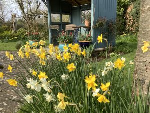 Now we are in our eighteenth year with a level garden – a joy after all those terraces, it’s taken time to eliminate all the giant conifers we inherited and introduce some colour. Spring is wonderful, first the snowdrops, then daffodils appear in abundance so there are plenty to pick, carpets of primroses are followed by magical patches of fritillaries. The pots are full of tulips but they are too precious to pick so I still need to buy bunches of them, soon I am itching to dump the tulips and plant something else in the pots – what will it be this year?