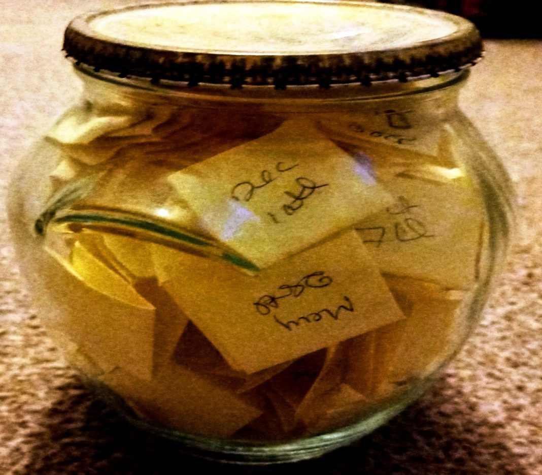 Every year, from January to December, each time something happens in my life that either gives me pleasure, or that I feel grateful for in some way, I write it on a note, fold the note, write the month on the outside and pop it into what I call my happy jar.