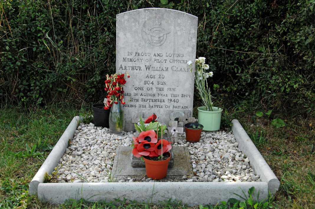 The body of 20-year-old Pilot Officer Arthur William Clarke lies in one of the fields close by, buried inside the tangled remains of his Hawker Hurricane beneath the soil and the grazing sheep. Born in Altrincham, Cheshire, Arthur Clarke joined the RAF on a short-service commission in 1939. After training he converted to Hurricanes and joined 504 Squadron based at Hendon, Middlesex. He was shot down on the afternoon of September 11, 1940.