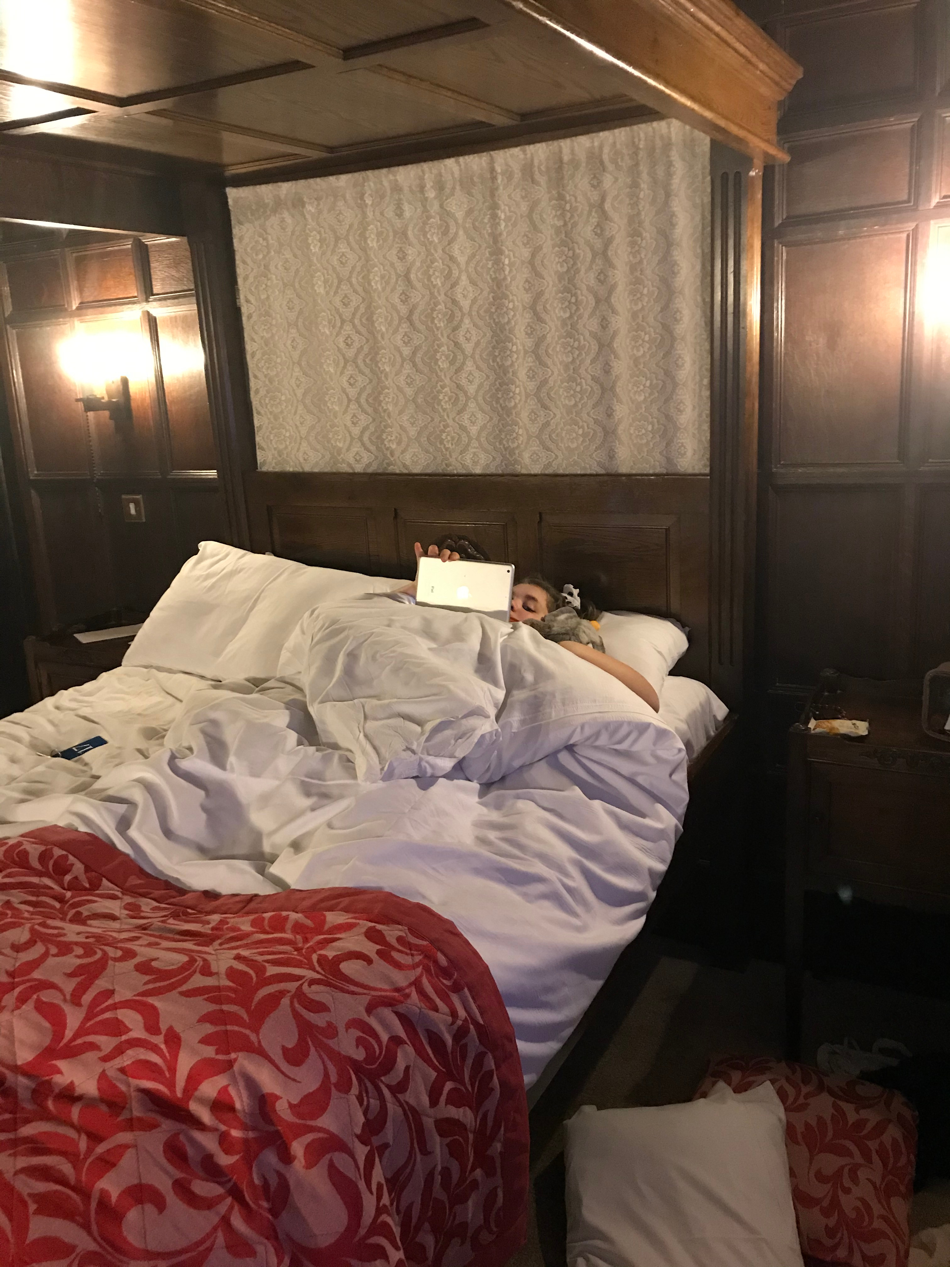Isabelle had researched the most scary room to stay in and concluded it was room 17 “Kingsmill”. When we were shown in to this large and beautiful room, with a four poster bed, I was relieved to find it warm and welcoming with a large en-suite bathroom where I could leave the light on and the door open.
