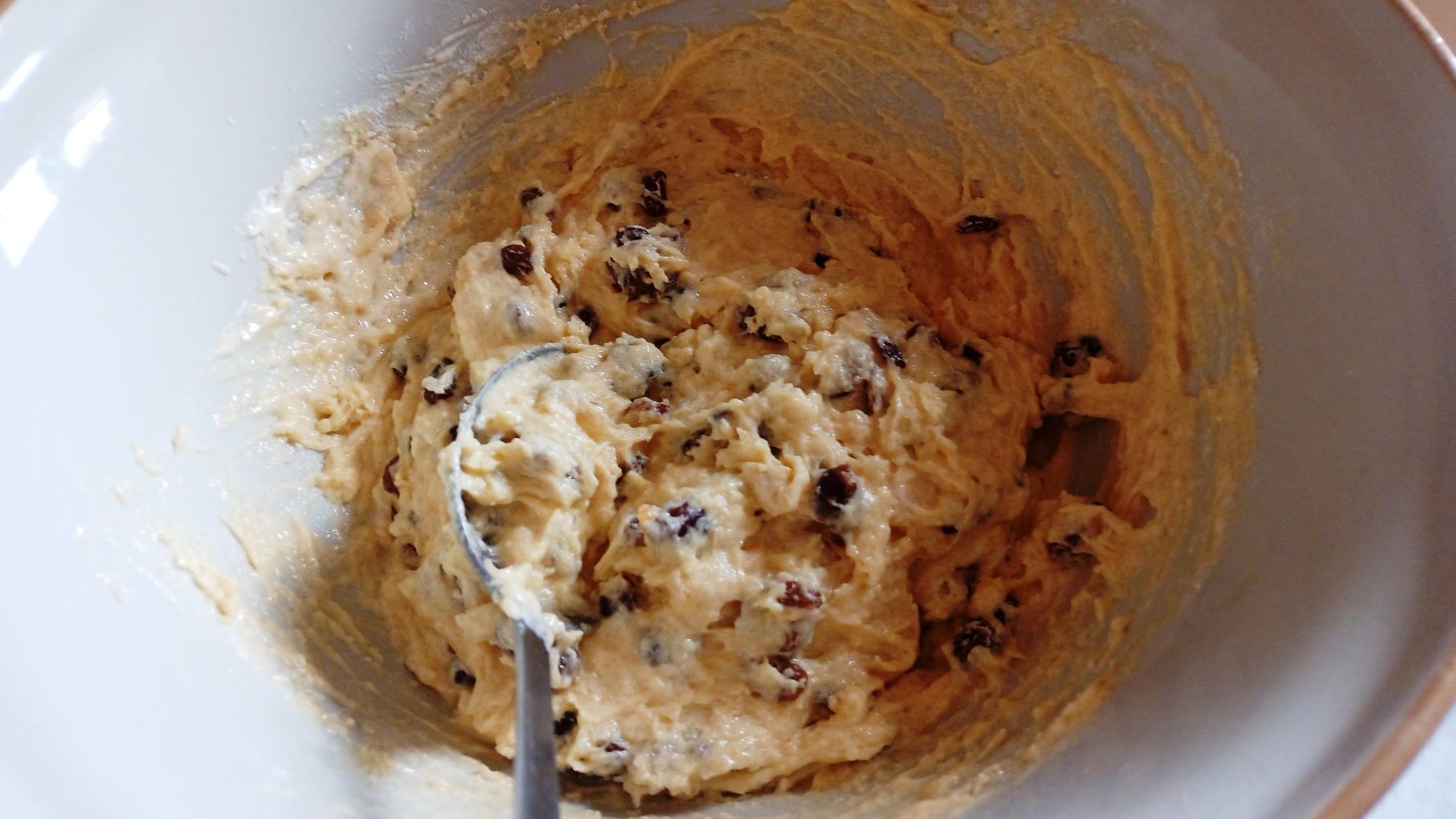 Gently fold the wet into the dry, lastly folding in the dried fruit, ensure there is no flour left in the bottom of the bowl.