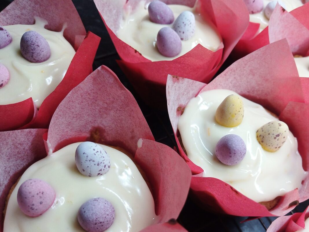 When muffins are cooled, top each one with the icing and finish with three mini-eggs