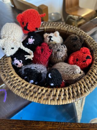 Sandra Lanigan, who has been with the group the longest, told me, “The knitting group began seven years ago initially to support Janet Waddams, who was organising the town to collect clothes to go to Syria. The Brighton-based charity called Samara’s Aid Appeal oversaw collection and distribution. Knitted squares and donations of wool flooded in, some from as far away as the US, as well as blankets and knitted sweaters of all sizes. Sadly, Janet and other founder members have died, and the Syrian government decreed that everything had to go via them, so for the last five years the main focus has been on knitting things that can be sold and donations being given to charities.“