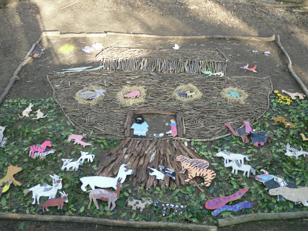 Peasmarsh CE Primary School has its own Forest School within the grounds so the children use it continually. We have trained Forest School leaders. We are very lucky! The scene was created on Monday March 13 and was approximately 15ft square. It is still there at the moment although the animals were taken in to be kept for display inside the school. Parents were invited to see it that afternoon.
