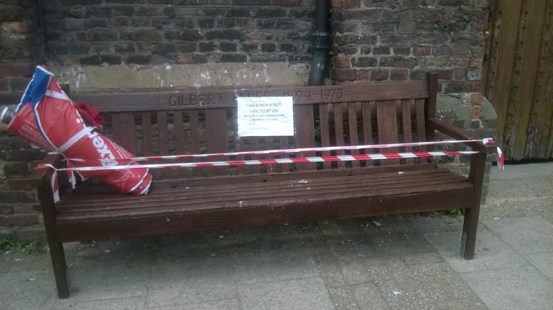 For weeks one of the benches in front of the Grammar School Record Shop had a health and safety band across it and as is usual in our town rumours and stories circled around, like who decided it was unsafe, what is the Town Council doing, why is it taking so long for something to happen? The funny thing was that visitors and locals didn’t take much notice and sat on the bench anyway.