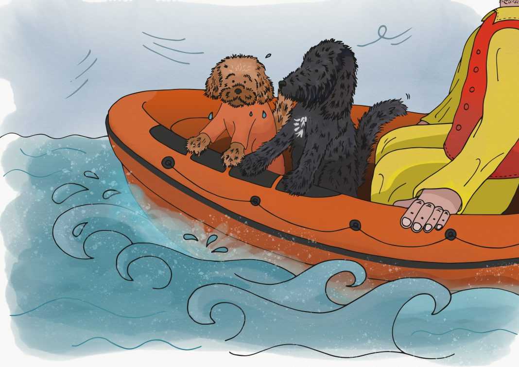 As fast as he swam the more the gale winds pushed him back. For every three doodle paddles he swam forward the winds pushed him back two. The waves grew stronger and he was tossed about even more. At times he wondered if he was even going in the right direction. The sound of Phoebe gurgling and barking kept him going. He knew he had to save her. As he was concentrating so hard on saving her, he didn’t notice the sound of a motor in the distance.